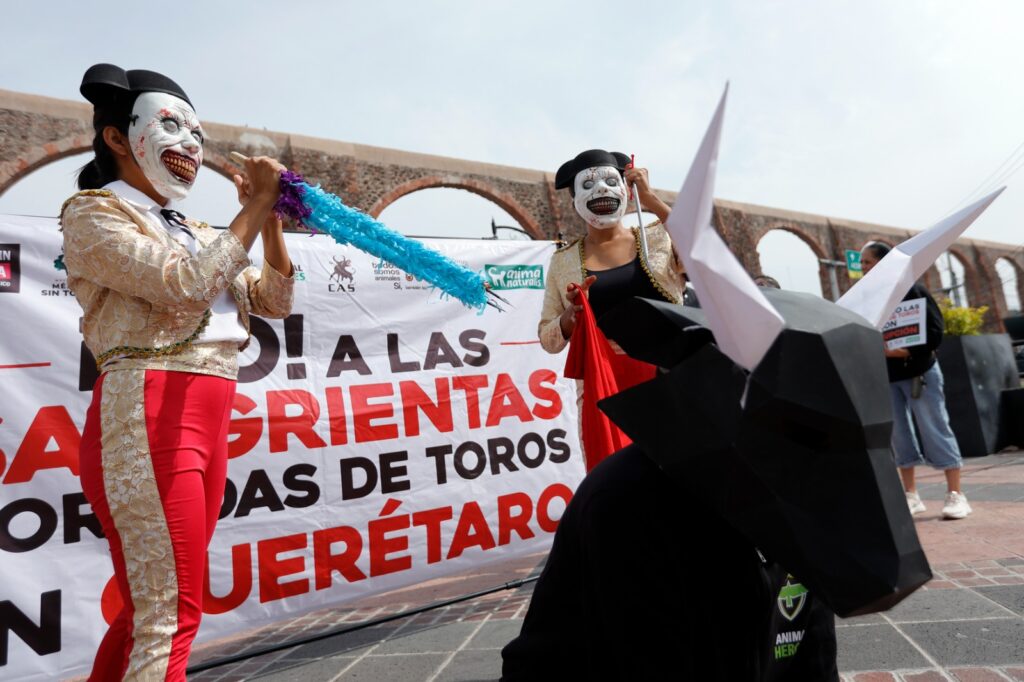 Con una acción escénica simbólica y pancartas en el camellón central de la intersección entre Calzada de Los Arcos y Boulevard Bernardo Quintana, representantes de organizaciones animalistas plantearon que estos espectáculos vulneran tanto leyes federales como principios constitucionales.