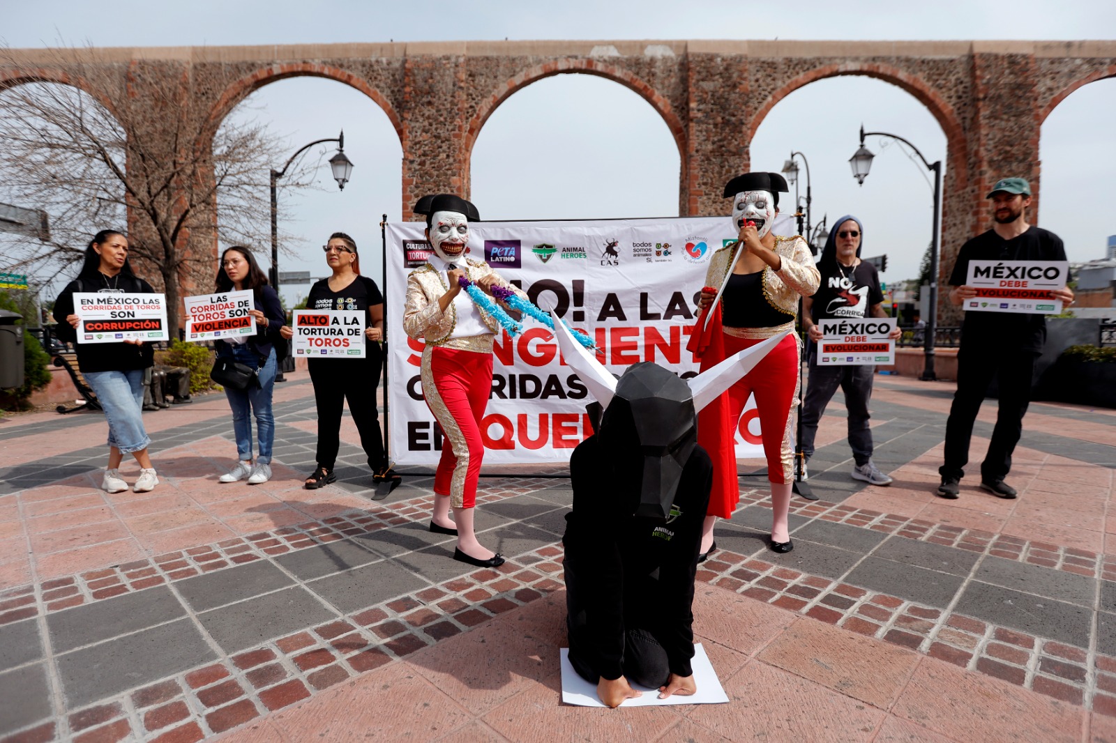 Un grupo de activistas realizó una intervención pública frente al acueducto de Los Arcos este miércoles para exigir la prohibición definitiva de las corridas de toros en el estado.